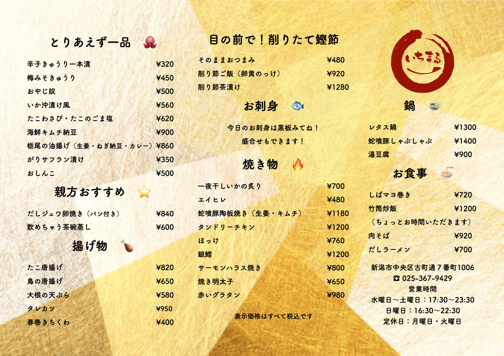 居酒屋 古町7番町の落ち着いた和空間新潟市中央区古町通7番町1006 営業時間:17:30 - 23:30 (日曜・祝祭日:16:30 - 22:30) 定休日:月曜・火曜 4月29日〜5月9日は休まず営業いたします 5月10日〜14日はお休みです予約お問合せ 025-367-9429